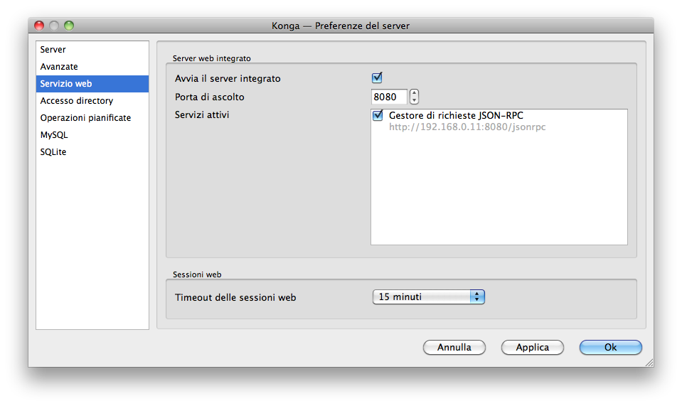 Spuntando l’opzione “Avvia il server integrato” e lasciando selezionato il servizio di gestione delle richieste “JSON-RPC” si predispone Konga per rispondere alle richieste all’indirizzo: