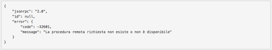 Come potete vedere anche la risposta è in formato JSON, l’elemento che più ci interessa nella risposta è “error” che in questo caso è stato valorizzato a null, cioè nessun errore, nel caso in cui Konga ci risponda con un errore, l’elemento “error” conterrà uno o più codici di errore (“code”) e la corrispondente descrizione dell’errore, ad esempio se avessimo specificato un metodo inesistente avremmo ottenuto questa risposta: