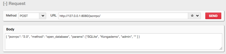 3. il contenuto della richiesta (Body), per questa prima richiesta utilizzeremo il metodo list_databases per ottenere la lista dei database che possono essere aperti dal Konga server. La richiesta deve essere preparata secondo le regole del formato JSON: