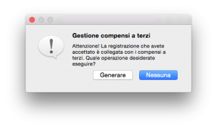 Quando una registrazione di prima nota interessa un fornitore che ha l’attributo “compensi a terzi” impostato a “sì” e quindi è stato abbinato ad una scheda di un percipiente, il programma visualizzerà una finestra di dialogo adeguata al contesto della registrazione (generare una nuova scheda nell’archivio compensi a terzi se si tratta di una registrazione di tipo IVA, oppure generare o pagare nel caso di una registrazione di tipo generico). Nel caso di generazione di una nuova scheda dei compensi a terzi, il programma visualizzerà una nuova scheda dell’archivio compensi a terzi già precompilata con i dati della registrazione di prima nota. In caso di pagamento il programma visualizzerà la lista dei compensi in attesa di pagamento e l’utente potrà indicare quelli che dovranno essere considerati pagati.