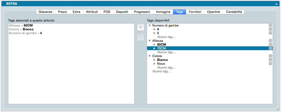 Nella sezione “Extra” della scheda dell’articolo di magazzino è stato aggiunto un “tab” denominato “Tags”. Nel riquadro di destra è possibile creare nuovi tags (etichette) da abbinare agli articoli, mentre nel riquadro di sinistra viene visualizzata la lista dei tags abbinati all’articolo in esame. I tags hanno un’organizzazione gerarchica, cioè è possibile dei tags figli di altri tags, in tal caso quando si associa un tag all’articolo di magazzino, vengono abbinati automaticamente i tag di livello superiore (vedere esempio nella figura soprastante).