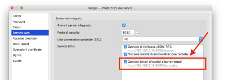 Gli utenti del modulo di gestione del magazzino possono utilizzare il nuovo archivio delle scansioni barcode, questo archivio è utile solo nel caso in cui si stia utilizzando un terminale portatile intelligente che si può sincronizzare con il Konga server, come ad esempio il modello Honeywell Dolphin 75e. Per attivare la sincronizzazione dei dati di Konga con il lettore wireless è necessario abilitare il servizio “gestore lettori di codici a barre remoti” nella configurazione del server.