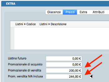 Il prezzo promozionale di vendita ora è stato distinto in due campi separati: IVA esclusa e IVA inclusa, in tal modo sarà possibile impostare e proporre il prezzo promozionale più corretto per il contesto di vendita utilizzato al momento. Il prezzo promozionale di vendita IVA inclusa verrà utilizzato dalla Emissione Scontrini (modulo POS), mentre il prezzo promozionale di vendita IVA esclusa verrà utilizzato nei preventivi, negli ordini da clienti e nei documenti fiscali. Il pulsante accanto al prezzo promozionale di vendita IVA inclusa permette di far calcolare al programma lo scorporo dell’IVA e proporre automaticamente il prezzo IVA esclusa.