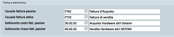 Nella tabella dei codici fissi, sezione contabilità, ora è possibile inserire le causali contabili ed i sottoconti di costo e di ricavo di “default”, che verranno utilizzati per proporre la registrazione di prima nota in base ai dati presenti nel file XML del documento elettronico.