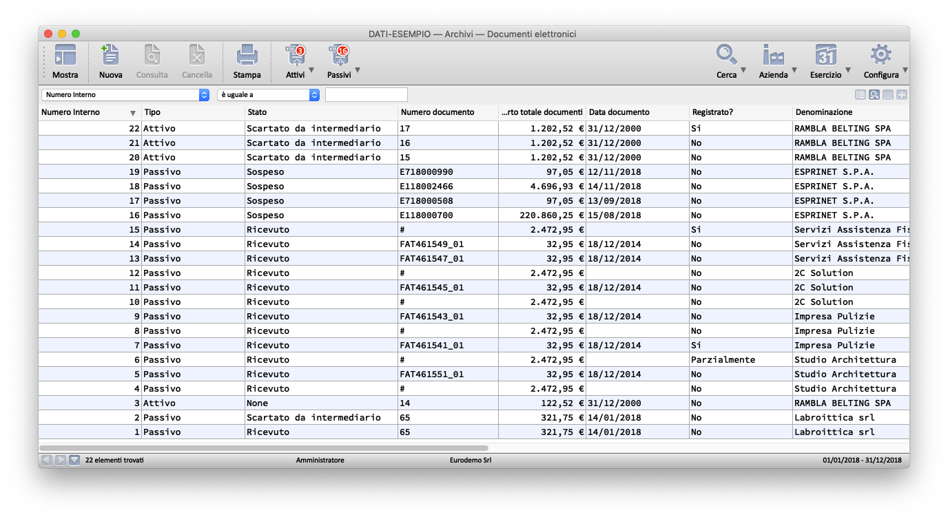 Ogni scheda dell’archivio dei documenti elettronici deve essere abbinata ad un file XML che contiene uno o più documenti emessi o ricevuti. Ad ogni documento elettronico viene assegnata la tipologia “Attivo” (fatture a clienti, note di credito a clienti) o “Passivo” (fatture da fornitori o note credito da fornitori) a seconda della partita IVA del cessionario presente nel file XML.