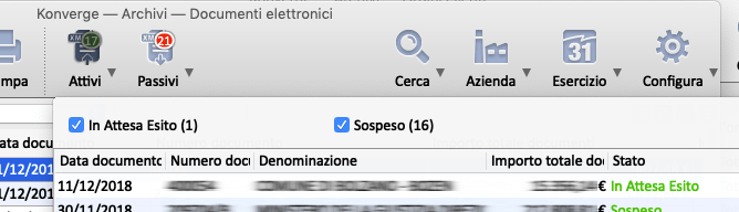 Per tenere traccia dei documenti ricevuti e dei documenti inviati che non sono andati a buon fine, Konga prevede due pulsanti denominati “Attivi” e “Passivi” nella barra degli strumenti nella visione a lista.