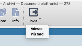 I documenti elettronici che hanno lo stato “Da Inviare“, vengono inviati automaticamente e periodicamente al SDI senza necessità dell’intervento dell’utente. I documenti elettronici nello stato “Sospeso” possono essere inviati al SDI sia cambiando lo stato in “Da Inviare”, sia utilizzando la funzionalità di invio immediato presente nella barra degli strumenti.