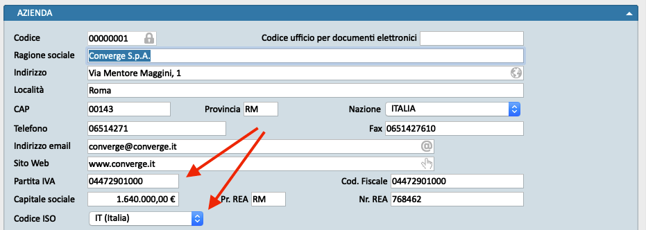 ATTENZIONE: per gli utenti che hanno stipulato il contratto per l’invio, la ricezione e la conservazione integrata con la 2C Solution, è importante che nella tabella azienda venga indicato il numero di partita IVA corretto ed inoltre che venga specificato anche il codice ISO della nazione corretto (usualmente IT).