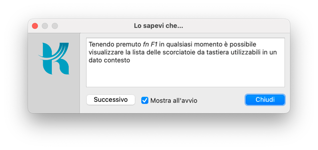 Per evidenziare funzionalità del programma meno intuitive, il programma ora mostra un suggerimento casuale ogni volta che si lancia Konga. Se si desidera evitare la finestra dei suggerimenti all’avvio, sarà sufficiente de-selezionare il pulsante “Mostra all’avvio”.