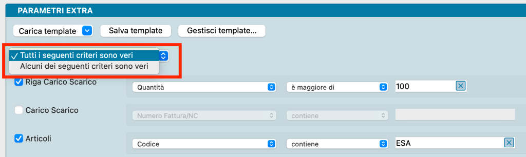 Nel caso in cui nel pannello dei “Parametri Extra” siano presenti più tabelle, nelle versioni precedenti era solamente possibile eseguire una ricerca dove “tutti i criteri venivano soddisfatti”, ora – nella nuova versione – è possibile anche indicare che si desidera eseguire una ricerca dove solo “alcuni dei criteri siano soddisfatti”, ovvero è possibile distinguere se le ricerche sulle diverse tabelle vengono collegate da un’operazione logica di tipo “AND” (Tutti i seguenti criteri sono veri) oppure di tipo “OR” (Alcuni dei seguenti criteri sono veri).