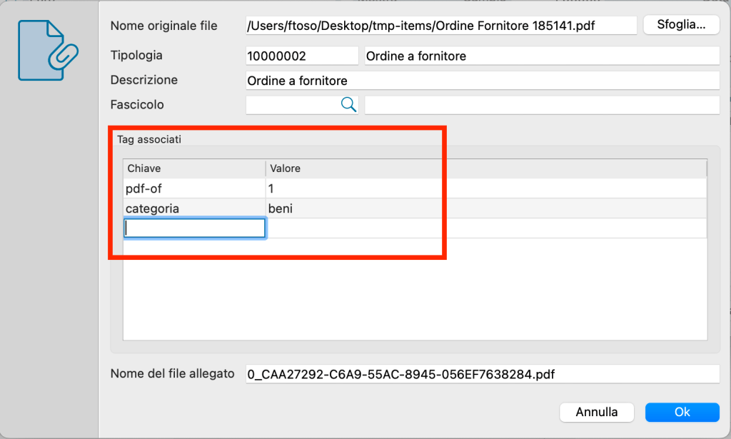 La finestra che permette di allegare i documenti alle schede di archivi e tabelle ora prevede la possibilità di assegnare dei “tag”, ovvero delle coppie chiave-valore, in modo da qualificare ulteriormente il documento che si allega. I tag dei documenti allegati possono essere utilizzati solo ai fini informativi, oppure possono anche essere utili per la gestione automatica dei flussi di lavoro, per la gestione dei fascicoli digitali, ad esempio: un documento allegato di una specifica tipologia e con uno o più tag abbinati può diventare la condizione per il passaggio del fascicolo ad uno stato differente.