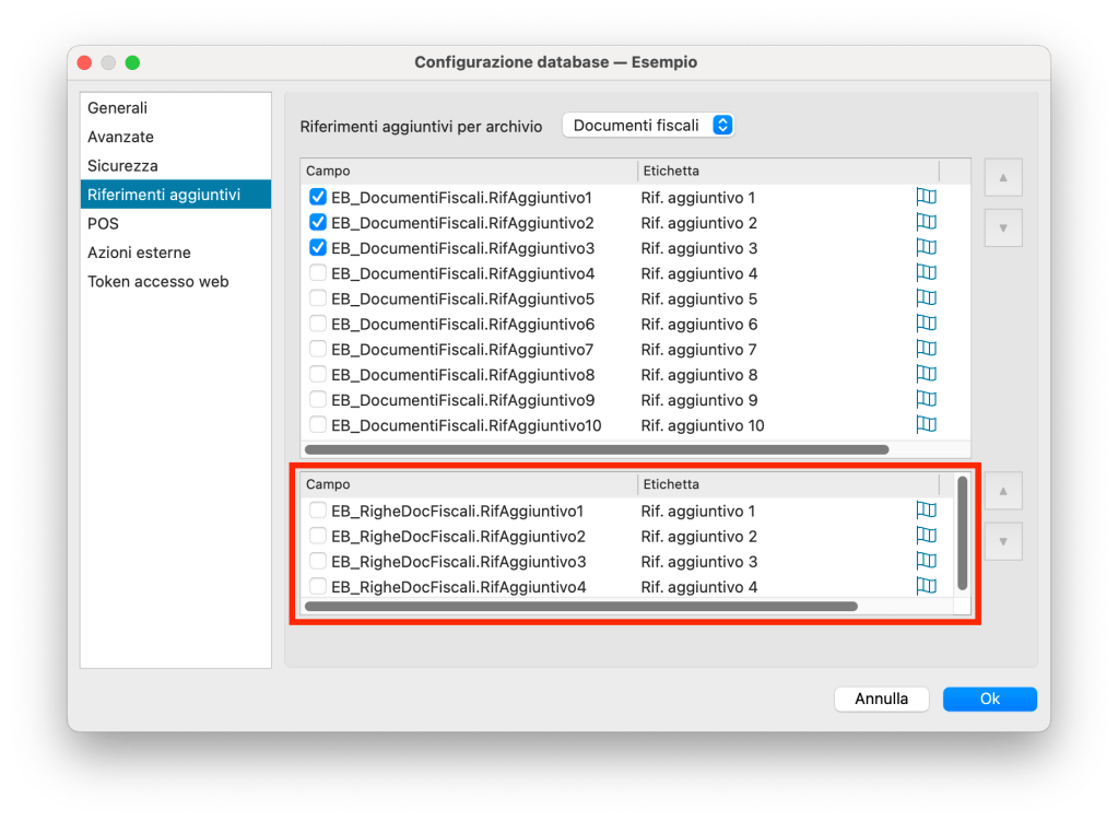 Questi campi compariranno come nuove colonne nella griglia delle righe del documento ed è possibile personalizzare l’etichetta che verrà abbinata alla colonna. I nuovi campi possono essere abilitati e personalizzati tramite la sezione “Riferimenti Aggiuntivi” della Configurazione del database.