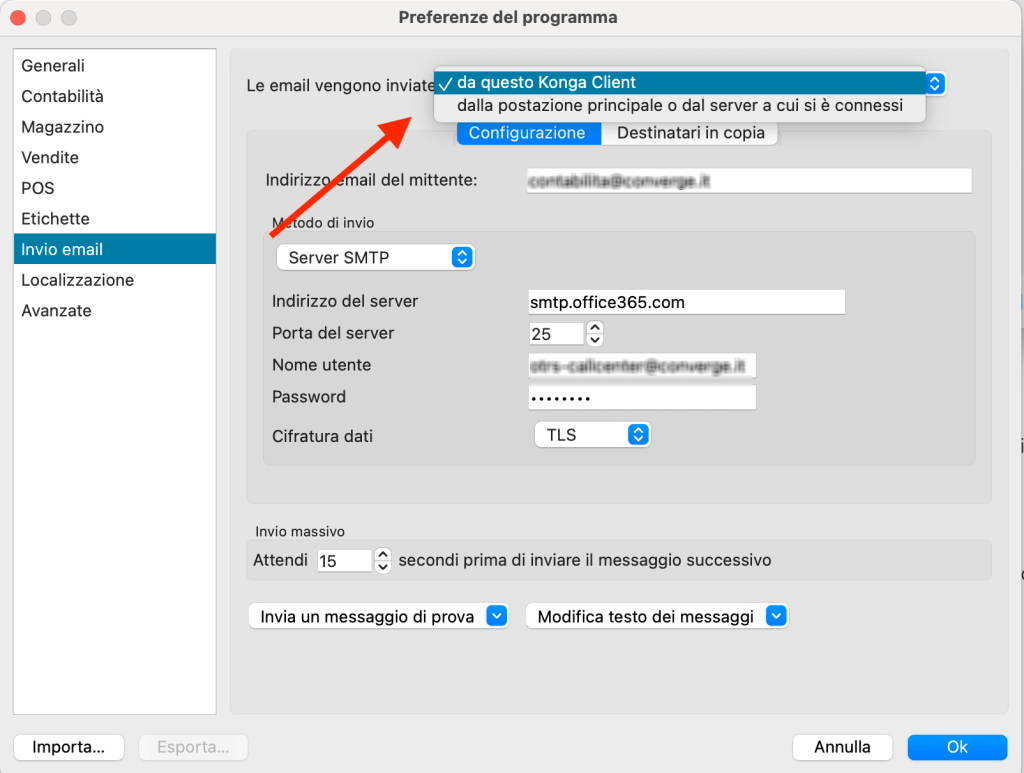 - Aggiunta la possibilità di delegare sempre l’invio delle email al Konga Server (o alla postazione principale), in modo da centralizzare la configurazione