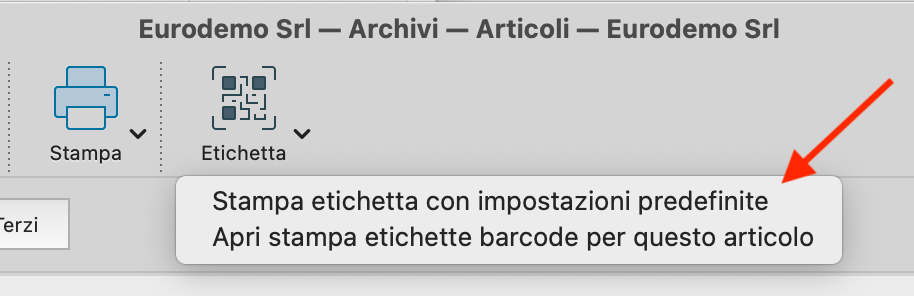 Utilizzando il pulsante “Etichetta”, presente nella scheda degli Articoli di Magazzino, è ora possibile scegliere se stampare direttamente l’etichetta con le impostazioni di default, oppure – come avveniva nella versione precedente – aprire il pannello della stampa etichette pre-compilato, con la possibilità di impostare dei parametri di stampa personalizzati.