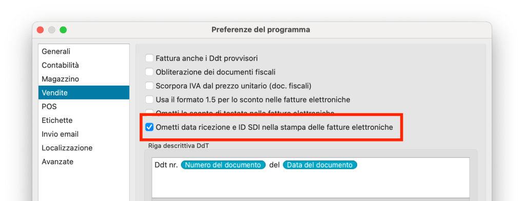 Nella sezione “Vendite” delle Preferenze del Programma è ora possibile indicare se si desidera omettere la data di ricezione e dell’ID SDI quando si esegue la stampa di un documento elettronico.