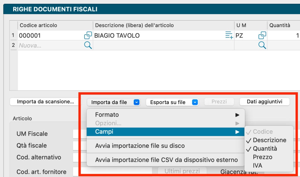 Le funzionalità per l’importazione/esportazione da file CSV o Excel delle righe di Preventivi, Documenti Fiscali, Ordini da Clienti, Ordini a Fornitori, Carico-Scarico sono ora un po’ più configurabili: utilizzando la scelta “Campi” è possibile indicare quanti e quali campi importare o esportare, i campi che possono essere selezionati sono i seguenti: