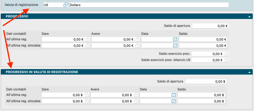- Aggiunti i dati contabili progressivi in valuta di registrazione nelle schede contabili, clienti e fornitori