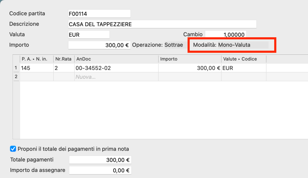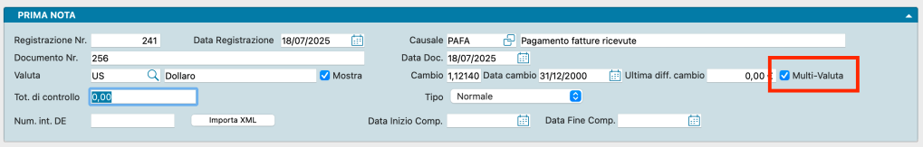 Sino alla versione 1.12.4 la registrazione di pagamenti e/o incassi in valuta era limitata alle partite aperte con la stessa valuta della registrazione di prima nota, ovvero non era possibile, ad esempio, registrare un pagamento in EUR di una partita aperta in US $ (dollari pari ad Euro). Nella nuova versione è ora prevista l’opzione “Multi-valuta”, che prevede la possibilità di pagare e/o incassare anche le partite aperte che hanno una valuta diversa da quella della registrazione.