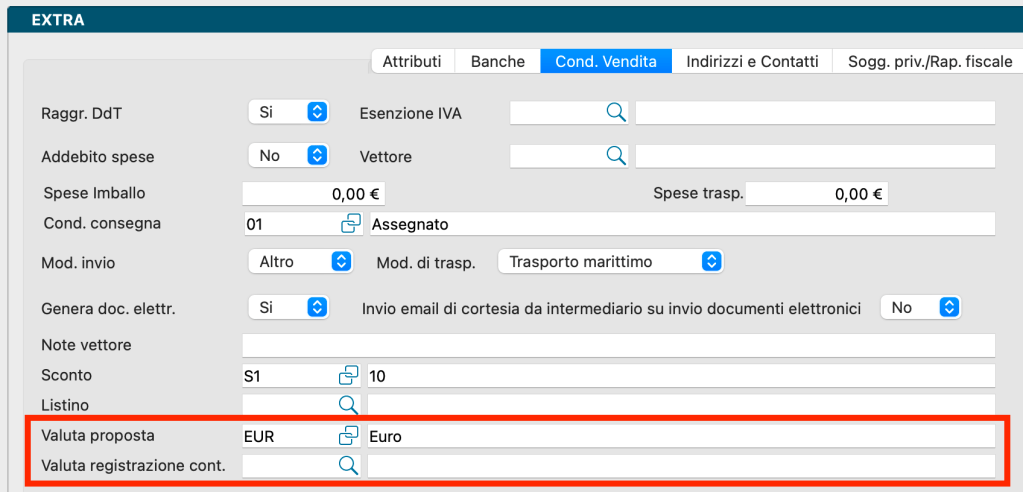 Nelle schede dei clienti e fornitori occorre distinguere la valuta proposta dalla valuta di registrazione: la valuta proposta è la valuta che viene proposta quando si utilizza la scheda in un nuovo documento, ad esempio un ordine o un documento fiscale, ovvero è la valuta preferita per le operazioni con il cliente-fornitore in esame. La valuta di registrazione contabile invece riguarda le registrazioni in prima nota e, come detto in precedenza, deve essere utilizzata quando si desidera gestire i progressivi e i saldi contabili in una valuta diversa dalla valuta di conto.