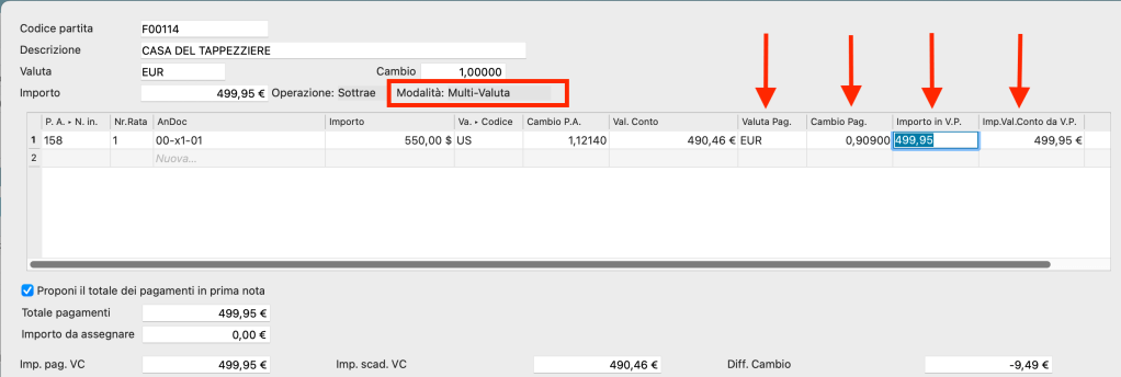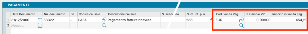 La possibilità di eseguire dei pagamenti in una valuta diversa da quella con cui in origine era stata creata la partita aperta, rende necessario indicare per ogni pagamento tre nuove informazioni: la valuta in cui è stato eseguito il pagamento, il coefficiente di cambio tra la valuta della partita aperta e la valuta del pagamento e l’importo espresso nella valuta di pagamento. Ogni pagamento ora riporterà tre importi: l’importo del pagamento espresso nella valuta della partita aperta, l’importo del pagamento espresso nella valuta di conto e l’importo del pagamento espresso nella valuta di pagamento; ovviamente, nel caso di una partita aperta in Euro, pagata in Euro, i tre importi coincideranno e il coefficiente di cambio sarà uguale a “1”.