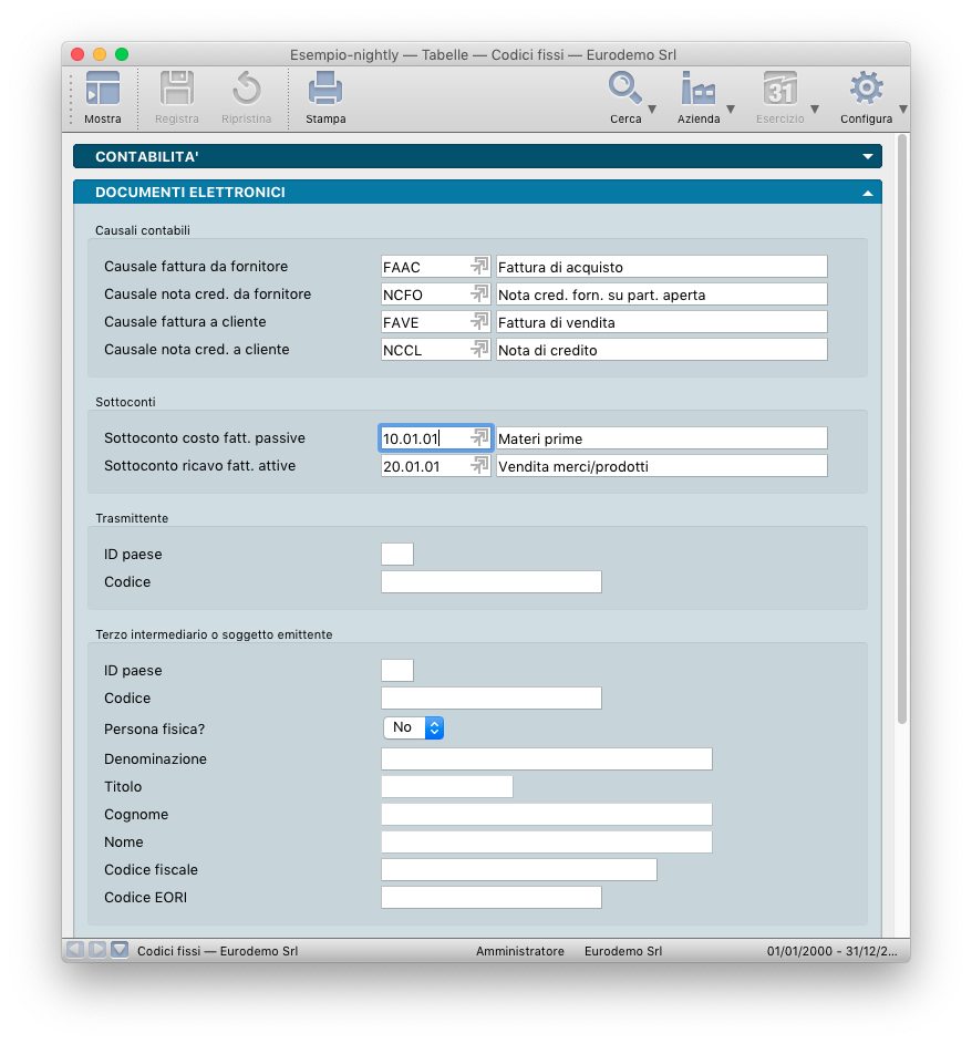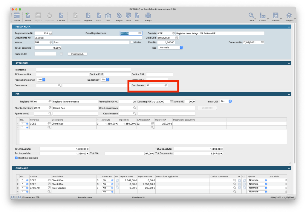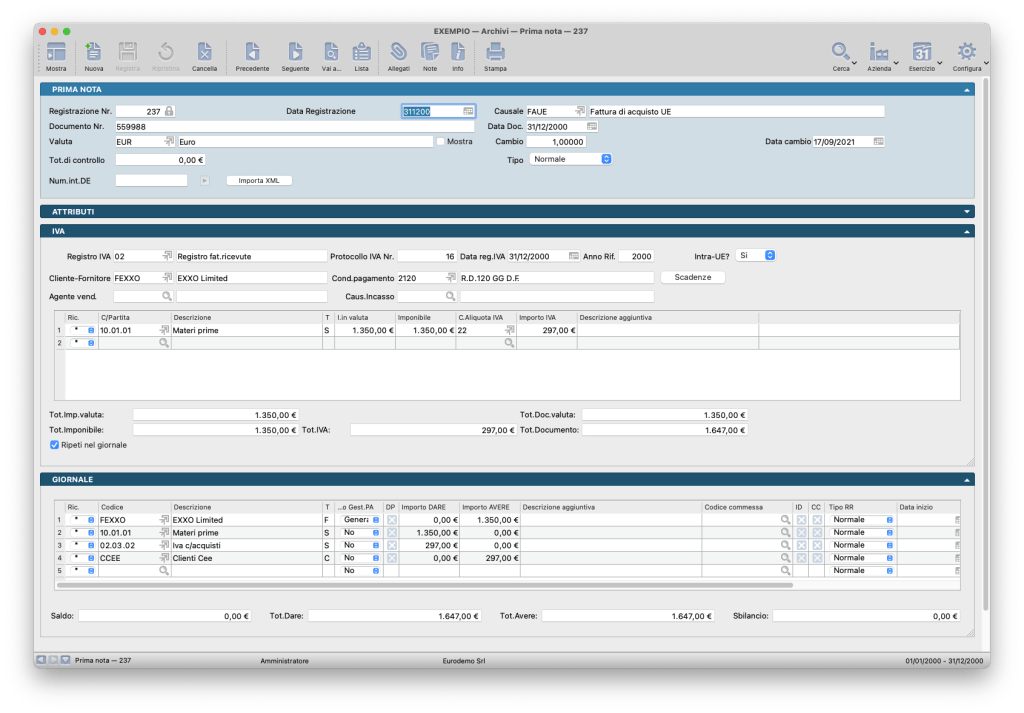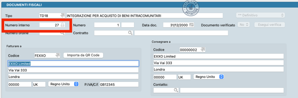Il documento fiscale, una volta confermato, genererà un documento elettronico dove il cedente/prestatore sarà il fornitore intracomunitario e il cessionario/committente sarà invece l’azienda che sta eseguendo la registrazione.
