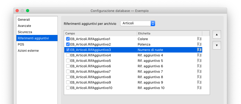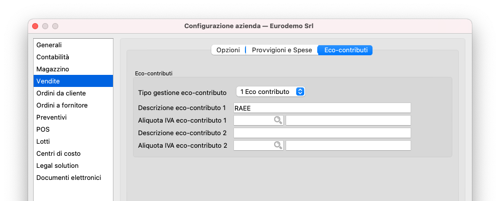 Sono stati aggiunti i campi “Eco-contributo 1” e “Eco-contributo 2” nella sezione “Contabilità” della scheda degli articoli di magazzino. Per attivare la gestione automatica degli eco-contributi, sarà necessario indicare nella sezione vendite della configurazione dell’azienda quale gestione si desidera attivare: 1 Eco contributo o 2 Eco contributi, la descrizione dell’eco-contributo (ad es. RAEE), l’aliquota IVA da abbinare e, quindi, assegnare l’importo unitario dell’eco contributo nella nella scheda degli articoli di magazzino che sono interessati dal contributo.