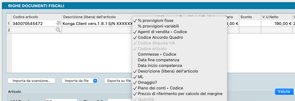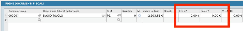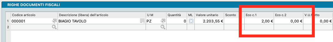 Gli importi dell’eco contributo verranno proposti automaticamente al momento dell’inserimento delle righe dei preventivi, degli ordini da clienti e dei documenti fiscali. Sono presenti due nuovi campi nelle righe di questi archivi.