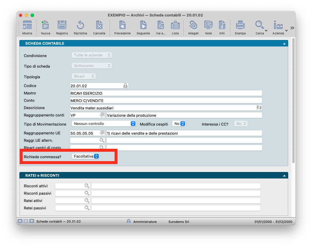 - Si: in questo caso il programma mostrerà un errore se si tenta di registrare una riga di prima nota che utilizza il sottoconto in esame senza indicare un codice commessa