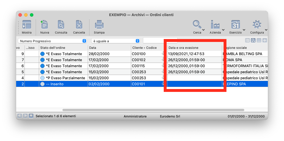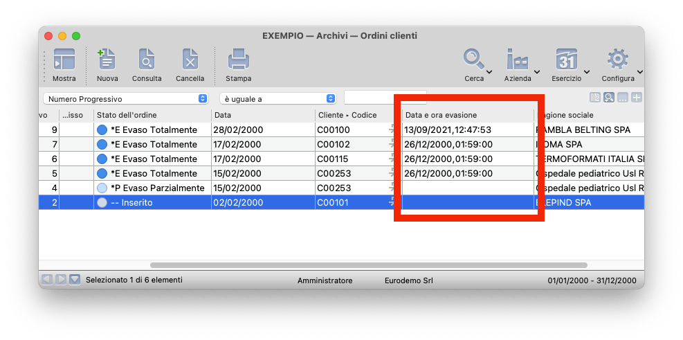 Nella lista dei campi che possono essere visualizzati nella visione “a lista”, degli ordini a fornitori e degli ordini da clienti, è ora possibile selezionare “Data e ora evasione”: questo campo viene valorizzato automaticamente dal programma ogni volta in cui lo stato dell’ordine diventa “Evaso Totalmente”.