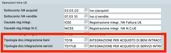 Operazioni intra-UE: integrazione IVA per acquisti intracomunitari di beni (TD18) e integrazione IVA per acquisti intracomunitari di servizi (TD17).
