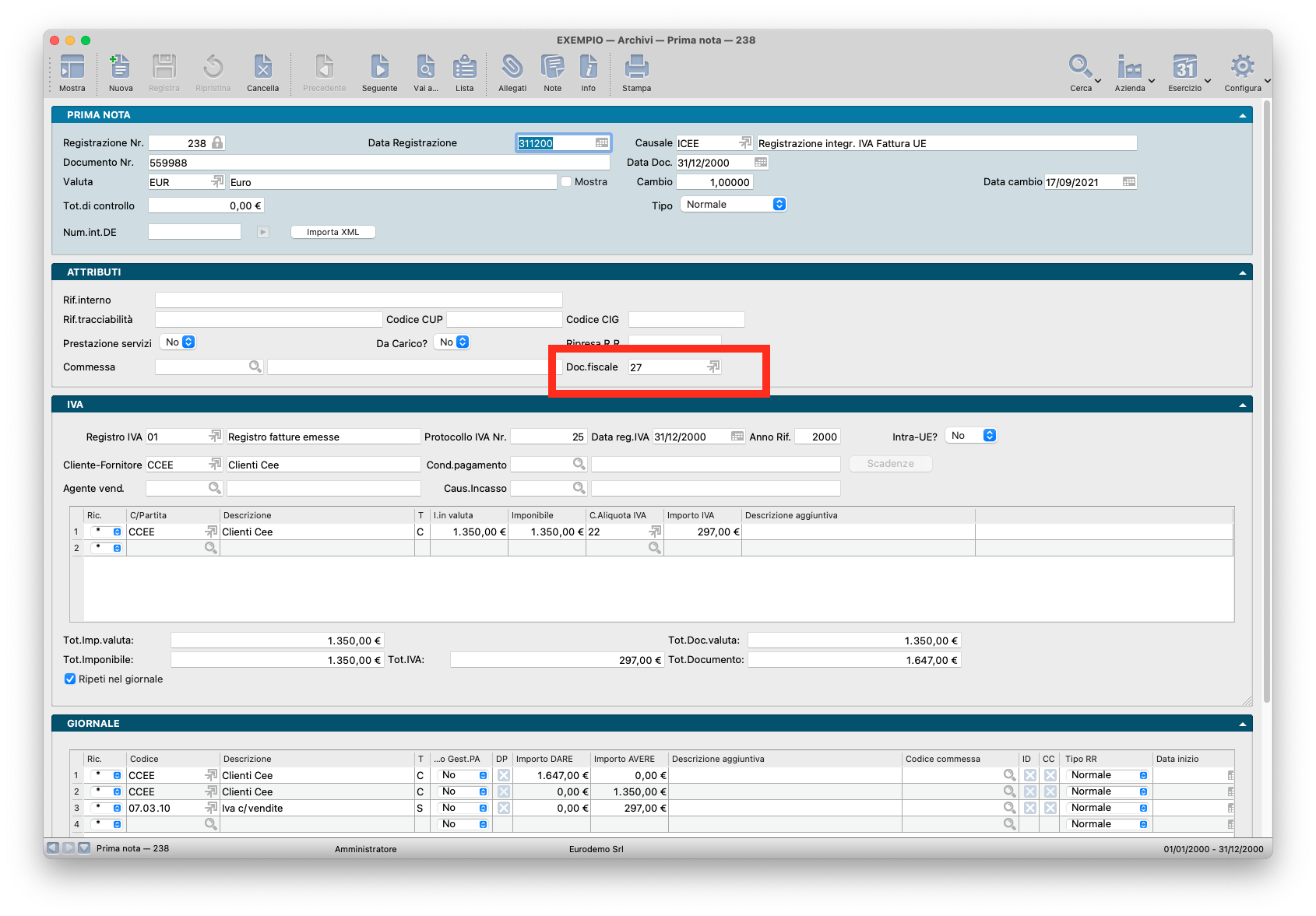 Come si può vedere qui sopra, nella figura della registrazione integrativa IVA, quando il programma genera automaticamente anche il documento fiscale integrativo per il SDI, viene valorizzato il campo “Doc. Fiscale” con il numero interno del documento fiscale collegato.