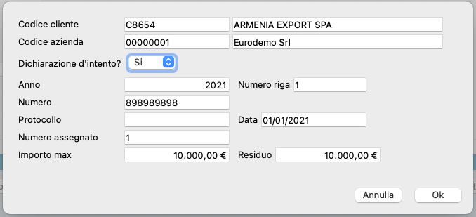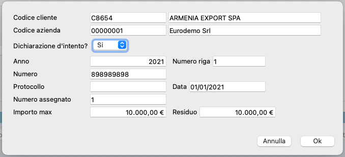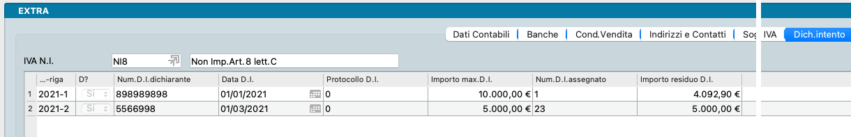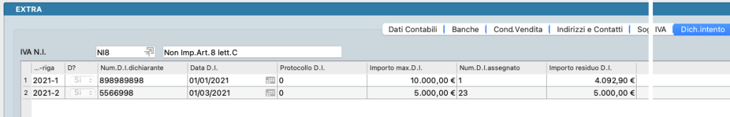 Ogni dichiarazione di intento registrata all’interno dell’anno solare ha ora un attributo denominato “riga” (inizialmente uguale a 1), che verrà incrementato automaticamente nel caso in cui si aggiunga una nuova dichiarazione di intento per lo stesso anno solare.