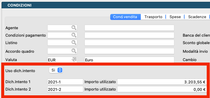 Nella sezione delle condizioni di vendita dei documenti fiscali sono stati aggiunti i campi per l’abbinamento di due dichiarazioni di intento